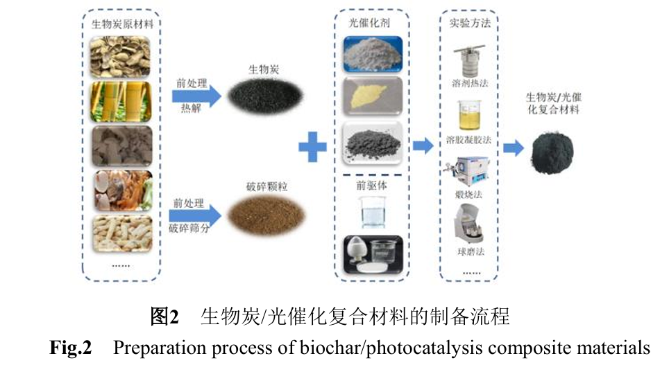 制备方法对于生物炭/光催化复合材料的功能性具有较大影响,目前常见的制备有溶剂热法、溶胶凝胶法、煅烧法、水解法、球磨法和浸渍法等[28]。