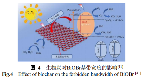 由于生物炭、石墨烯、碳纳米管、氮化碳等碳基材料均可以捕获半导体材料导带产生的电子,同时形成金属氧-碳结构促进了电荷的传输与转移,因此能够有效降低光催化剂的禁带宽度[39]。
