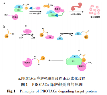 2022年,Crews等[11]提出了PROTACs概念,即利用细胞内的天然泛素蛋白酶体系统诱导靶蛋白降解的全新药物开发技术。PROTACs是由靶蛋白的配体和E3泛素连接酶配体通过连接子相连接组成的异源双功能化合物[12]。PROTACs分子结构中的靶蛋白配体可以靶向捕获靶蛋白,分子结构另一端的E3泛素连接酶配体便开始招募E3泛素连接酶到靶蛋白附近,形成“靶蛋白-PROTAC-E3泛素连接酶”三元复合物,为靶蛋白贴上“废弃物”(泛素化,Ubiquitin,Ub)标签。被Ub标记的靶蛋白被细胞内的蛋白酶体26S识别并降解。当靶蛋白被降解后,这种双功能分子能够多次循环发挥新一轮的降解作用[13](图1a)。PROTACs的泛素化过程是由一系列名为E1、E2、E3的泛素化酶介导的。首先,泛素甘氨酸端的羧基(-COOH)连接到泛素活化酶E1的巯基(-SH),这个步骤需要以ATP作为能量,使其在泛素和E1之间形成一个硫酯键(-S-CO-)。然后,E1将活化后的泛素通过交酯化过程交给泛素结合酶E2。最后,泛素连接酶E3介导泛素从E2上转运到靶蛋白的赖氨酸残基上,完成对靶蛋白的泛素化标记[14](图1b)。