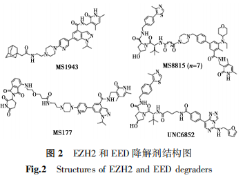 Potjewyd等[41]基于EED抑制剂和VHL配体(VH032)设计合成了UNC6852(图2)。UNC6852采用含有3个亚甲基的短链烷基作为连接链,可以高选择性地降解EED、EZH12和SUZ3,导致H3K27me3水平降低,在弥漫大细胞淋巴瘤DLBCL中具有明显的抗增殖作用。
