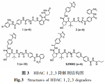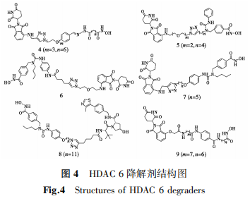 CI-994是早期研发的HDAC 1、2、3的选择性抑制剂。基于CI-994,以泊马度胺作为E3连接酶配体开发的一系列PROTACs,化合物1(图3)是最有效的非选择性HDAC降解剂[46]。在低浓度下能降解巨噬细胞RAW 264.7中的HDAC 3,在较高浓度下可降解RAW 264.7中的HDAC 1和HDAC 2。