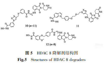 2022年,Chotitumnavee等[57]基于HDAC 8亚型选择性抑制剂NCC-149设计合成了一系列PROTACs,从中获得了首个HDAC 8亚型选择性降解剂10(图5),在人T淋巴母细胞Jurkat中对HDAC 8降解的DC50为0.70 μmol/L,对HDAC 1、HDAC 2和HDAC 6亚型未显示出明显的降解。
