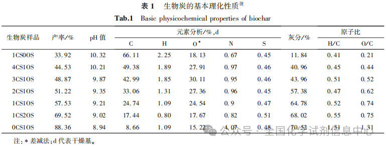 表1为热解温度为500 °C、CS粒径为0.20~0.30 mm和热解时间为30 min下所制备生物炭的产率、pH值、元素(C、H、O、N、S)含量和灰分等基本理化性质。可以看出,随着OS比例逐渐增高,共热解生物炭的产率和灰分逐渐增高,是由于OS中含有SiO2和金属氧化物而导致的。1CS0OS的pH 10.32,随着OS比例逐渐增大,pH值逐渐降低,降至最低pH 8.94。生物炭的元素(C、H、O、N、S)含量也发生明显改变,C和H元素会随着OS比例的增加而降低。H/C和O/C随着OS比例的增加,呈上升趋势。