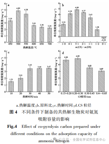 图4a为不同热解温度、m(CS):m(OS)=3:1、CS粒径为0.20~0.30 mm和热解时间为30 min下的共热解生物炭对氨氮的吸附容量的影响。可以看出,热解温度逐渐升高,其吸附容量先升后降,当热解温度为500 °C时,对氨氮的吸附容量最大。油页岩最佳热解温度区间为450~500 °C[22],在450 °C时油页岩热解程度较低,从而导致了对氨氮的吸附容量低。而在高温时,CS和OS共热解使其表面官能团热解,如C=O的断裂重组和-COOH的脱羧[19],与氨氮发生配位作用和离子交换的官能团数量逐渐降低,使得其对氨氮的吸附容量降低。