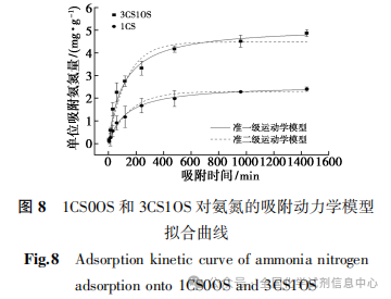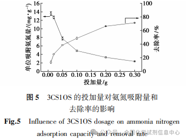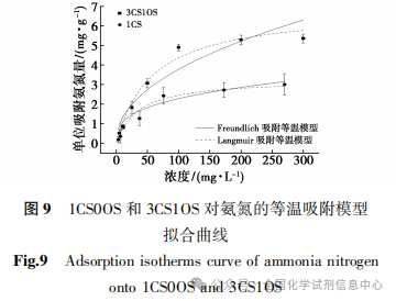 3.3 通过SEM-EDS、零电点的测定、FT-IR、吸附动力学模型和吸附等温线模型表明了3CS1OS吸附氨氮机制为离子交换、配位作用、静电吸附。3CS1OS对氨氮的吸附符合准二级动力学和Langmuir等温线模型来描述,表明了化学吸附和单分子层吸附过程。吸附机制为离子交换、配位作用、静电吸引。