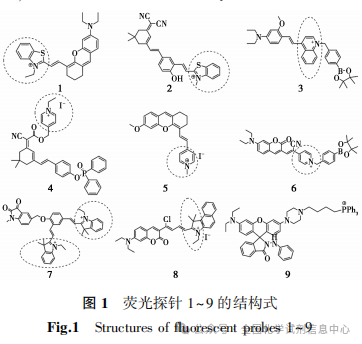 在亚细胞水平上,线粒体被形象地称为细胞发电厂,参与多种细胞过程,包括ATP生成、中枢代谢和细胞凋亡[12]。线粒体功能障碍可能来自于ONOO−高表达、高粘度等微环境异常,这些被认为是机体疾病产生的可能因素[13-15]。因此,如何准确地跟踪细胞线粒体ONOO−的变化对疾病诊断具有重要意义。线粒体膜电位一般为-180~-220 mV,因此具有离域正电荷的染料更容易穿透线粒体膜并随后在其内部积聚[16]。常见的带正电荷线粒体靶向单元有三苯基膦阳离子单元(TPP+)以及经过烷基化后的噻唑离子单元、喹啉离子单元、吡啶离子单元、吲哚离子单元等 [17-21],下面分别介绍这5个靶向单元的9个相关荧光探针,探针1~9的结构式见图1。