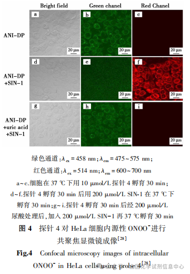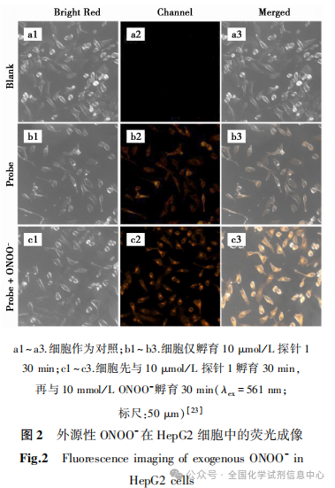 过氧亚硝酸盐(ONOO−)是一种重要的活性氮物种(RNS),它在细胞氧化还原稳态中起着至关重要的作用,可以调节细胞内氧化还原平衡并参与信号转导过程。与其他ONOO−的检测分析方法相比,荧光检测法具有操作简单、实时性好、灵敏度高等优点。另外,ONOO−的生理功能很大程度上依赖于亚细胞器,所以细胞器靶向的ONOO−荧光探针具有重要价值,也可以进一步通过细胞荧光成像直观地观察细胞器中ONOO−的含量变化。