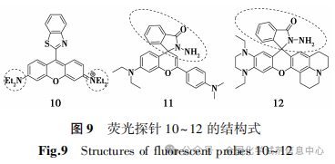 溶酶体是细胞中在pH 4.0 ~ 5.5之间的重要酸性细胞器[37]。溶酶体pH值的变化可以反映机体代谢过程和细胞状态[38]。一旦溶酶体pH异常,细胞功能受损,可引起神经退行性、溶酶体贮积障碍等疾病。最近的研究也表明,异常水平的ONOO−可诱导溶酶体膜透性(LMP)并导致细胞死亡[39]。所以,开发可以靶向溶酶体的ONOO−荧光探针具有重要的现实意义[40]。利用溶酶体内酸性(pH 4.5~5.5)的生理环境,采用胺类结构的本身为弱碱性小分子探针,能够选择性地在酸性环境中积累,从而达到靶向溶酶体的效果[41]。靶向溶酶体的ONOO−荧光探针10~12结构见图9。