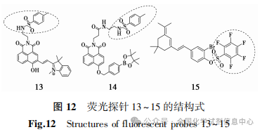 内质网是蛋白质合成、加工和运输的主要位点[45-47]。在亚细胞水平上,内质网(ER)是内源性ONOO−的直接靶点,氧化过程可能导致内质网功能障碍[48]。另一方面,ONOO−可以消耗与ER相关的Ca2+,导致人类血管内皮的ER应激和细胞凋亡[49]。因此,对内质网中ONOO−的原位精确检测对深入研究其生物学作用具有重要意义。苯磺酸基结构作为已经报道常用的内质网靶向基团,以下3篇文献介绍了以不同荧光团连接苯磺酸基结构达到靶向内质网的研究。探针13~15的结构式见图12。