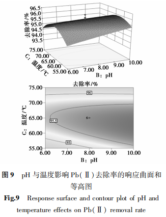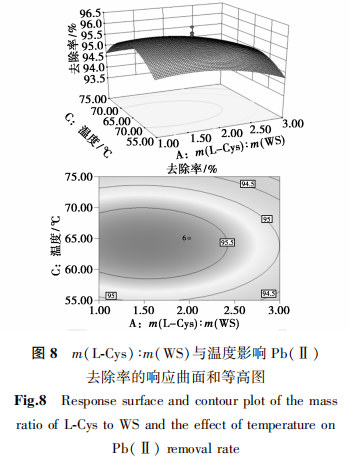利用Design-Expert 8软件分析m(L-Cys):m(WS)、温度、pH各因素之间交互作用及对Pb(Ⅱ)去除性能的影响,得到3个因素之间对Pb(Ⅱ)去除率的三维模型图和等高图(图7~9)。
