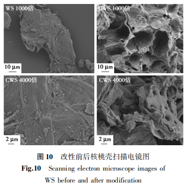 为观察改性后核桃壳表面形貌的变化,将WS和最佳条件制备下的CWS分别置于扫描电镜下观察,得到如图10所示不同放大倍数下的SEM图像。