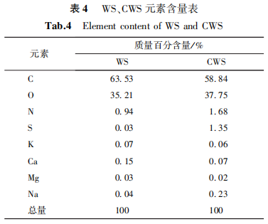 通过面扫等形式对WS与CWS表面进行能谱分析,改性前后WS与CWS表面元素含量变化如表4所示。