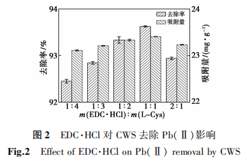 取0.5000 g WS、m(L-Cys) :m(WS)=2:1、NHS为0.1000 g,在温度为65 ℃的条件下反应4 h,EDC·HCl与L-Cys质量比对CWS除Pb(Ⅱ)的影响如图2所示。