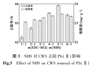 取0.5000 g WS、m(L-Cys) :m(WS)=2:1、m(EDC·HCl):m(L-Cys)= 1:1,在温度为65 ℃的条件下反应4 h,EDC·HCl与NHS质量比对CWS除Pb(Ⅱ)的影响如图3所示。