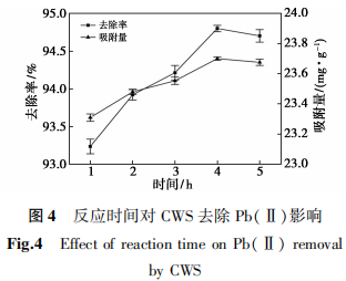 取0.5000 g WS、加入L-Cys与EDC·HCl,使m(L-Cys):m(WS)=2:1,反应时间对CWS除Pb(Ⅱ)的影响结果如图4所示。