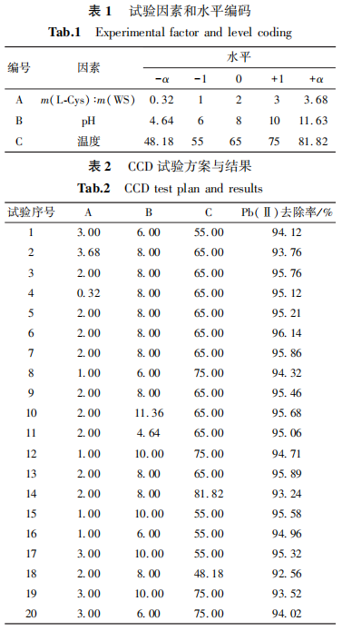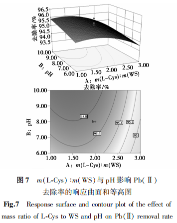 3.1 L-Cys和WS的质量比是影响CWS性能的主要因素,随着质量比的增大,CWS对Pb(Ⅱ)的吸附去除性能呈现先增后降的趋势;温度影响次之,时间影响最小,pH与温度之间存在交互作用对Pb(Ⅱ)去除有显著影响。