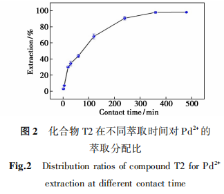 为了探究萃取动力学,本文研究了不同萃取时间对体系Pd2+萃取结果的影响(图2)。将一定量的萃取剂和2-溴己酸溶解于间硝基三氟甲苯中,制得含3 mmol/L萃取剂和1mol/L 2-溴己酸的有机相。而间硝基三氟甲苯的选择主要是因为其沸点高、难挥发,对有机配体和萃合物都有良好的溶解性。2-溴己酸作为溶剂萃取领域中常用的相改性剂,可以增加萃合物的亲脂性,并已广泛应用于高放废液中金属离子分离领域。
