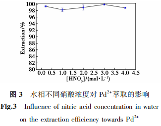 金属钯作为一种贵金属,具有耐腐蚀,耐高温以及强延展性等特点,因此在医疗器械、制药工程、燃料电池、珠宝及汽车催化转化器等领域都有着广泛的应用。随之而来的是钯离子带来的影响,人们除了会受到某些被微量钯离子污染的药物和医药产品的影响外,还会受到被手机辐射、珠宝、汽车排放物等的催化转化的钯离子威胁。并且含有Pd2+的废弃物极易污染生物和环境,导致潜在的危害,对人类健康构成威胁。因此,开发一种高效且能选择性分离Pd2+的溶剂萃取体系显得至关重要。