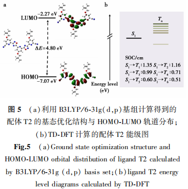 使用Gaussian 16软件,以B3LYP为泛函和6-31g(d,p)基组优化了配体分子T2的基态结构。同时,获得了单/三线态能级以及前线分子轨道分布,结果如图5a所示。配体分子T2的优化结构呈现“镊子”型,大量的氮原子和氧原子朝向骨架内部,有利于对钯离子的螯合作用。