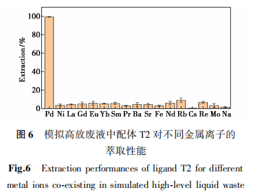 高放废液中含有超过40种金属离子,用于高放废液金属离子分离的萃取剂需体现出优异的选择性。因此,为研究配体T2的选择性萃取能力,以含3mmol/L萃取剂和1 mol/L 2-溴己酸为有机相,以及含17种金属离子的3 mol/L HNO3溶液为模拟高放废液水相,取有机相和水相各1 mL,装入离心管中25 ℃剧烈震荡8h以上,离心后取500mL水相用于检测Pd2+剩余浓度。实验平行2组。结果如图6所示,体系对Pd2+离子的吸附率达到了98.5%,表现出优秀的吸附能力。