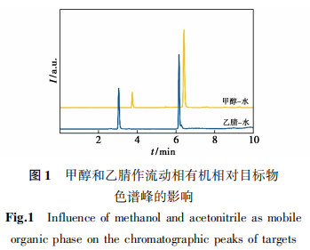 基于Agilent Eclipse Plus C18 RRHD超高效液相色谱柱考察了流动相的有机相为乙腈或甲醇时对目标物分离情况的影响,结果发现甲醇-水做流动相时峰宽稍窄且基线更平稳,如图1所示。