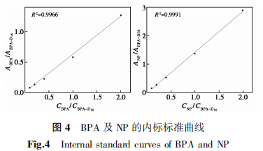采用内标法进行定量,将 5 种不同浓度的混标标准溶液(5、10、20、50、100 μg/L)在优化好的实验条件下进行测定,以目标化合物定量离子与内标物定量离子的峰面积比值为纵坐标,浓度比值为横坐标,绘制标准工作曲线。如图4所示,壬基酚、双酚A在上述线性范围内线性关系良好,相关系数(R2)分别为0.9991和0.9966,能够满足定量分析的需要。