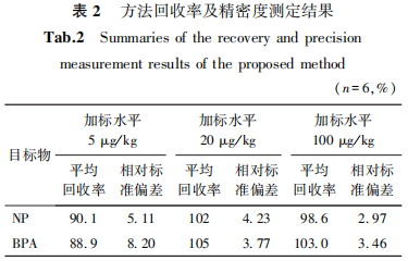 以实际空白样品进行3个水平的壬基酚和双酚A加标回收试验,加标水平分别为5.00、20.0和100 μg/L,每个水平进行6次平行试验,按照1.2.2前处理后,在1.2.3仪器条件下进行测定。其回收率结果如表2所示,NP和BPA的平均回收率在88.9% ~ 105%,相对标准偏差(RSD)为2.97% ~ 8.20%。