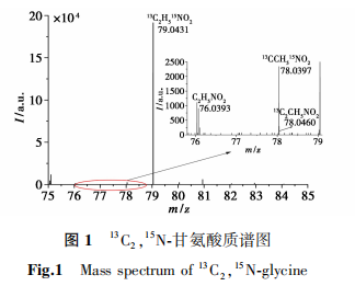 1、以13C2,15N-甘氨酸(13C2H515NO2)为例,考察了样品浓度、质谱扫描次数等对同位素丰度测定的影响,建立了稳定、准确的同位素丰度计算方法,实现了13C和15N同位素丰度的同时测定;