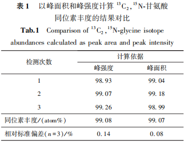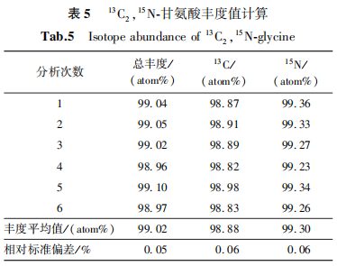 对浓度为1 μg/mL的13C2,15N-甘氨酸重复进样6次进行同位素丰度计算考察方法的稳定性。结果如表5所示,计算得到13C丰度为98.88%,15N丰度为99.30%,相对标准偏差(RSD)均为0.06%,总同位素丰度为99.0%,RSD为0.05%,说明该方法精密度良好。