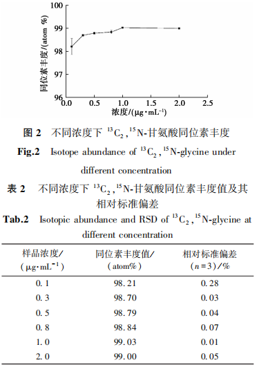 如图2和表2所示,当13C2, 15N -甘氨酸浓度为0.1 μg/mL时,计算得到的同位素丰度值为98.21%,相对标准偏差为0.28%,这可能是由于样品浓度较低时,含量较低的未完全标记化合物可能存在检测不到的情况,从而影响同位素丰度的准确计算;随着样品浓度增加,同位素丰度计算值也随之增加;当浓度增加至1 μg/mL时,同位素丰度计算值趋于稳定(99.03%),相对标准偏差小(0.01%),且与试剂标示值(同位素丰度:99 %)基本一致。因此后续实验选择样品浓度为1 μg/mL。