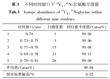 质谱图扫描张数对于丰度计算结果准确性也可能存在一定影响,对浓度为1 μg/mL 的13C2, 15N-甘氨酸进行同位素丰度分析,分别取包含峰顶点在内的不同时间窗口,如图3中所标识窗口,质谱图叠加进行同位素丰度计算,结果见表3,不同时间窗口下同位素丰度计算值相对标准偏差为0.02%,平均丰度为99.08%,说明质谱图扫描张数对同位素丰度计算值的影响不大。