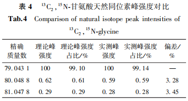 各标记形式化合物的质谱峰强度与同位素丰度计算值的准确性密切相关,而质谱仪的质量歧视效应[23]可能会导致某些标记形式化合物的分子离子峰强度降低或未检出,从而影响同位素丰度值计算。由于质量歧视效应客观存在且无法被消除,因此拟通过对13C2,15N-甘氨酸天然同位素(即M+1,M+2)分子离子峰的理论峰强度占比和实测值的比较,间接考察了高分辨的质量歧视效应。如表4所示,理论同位素峰强度占比和实测值的偏差小于5%,间接说明质谱仪器的质量歧视效应较小,对于同位素丰度的计算影响较小[24]。因此,在同位素丰度计算时可忽略质量歧视效应,直接利用公式进行丰度计算。