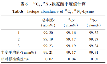 为考察方法的普适性,还对标记形式更为复杂的13C6,15N2-赖氨酸进行丰度计算。如表6所示,重复进样3次得到13C平均丰度为99.17%,15N平均丰度为99.31%,总同位素丰度为99.23%,与试剂同位素丰度标示值(同位素丰度值:>99.2%)基本一致,相对标准偏差<0.04%,进一步说明方法具有较高的准确性和稳定性,适用于双标记氨基酸的丰度计算,也将为双标记同位素试剂提供了一种新的质量控制方法。