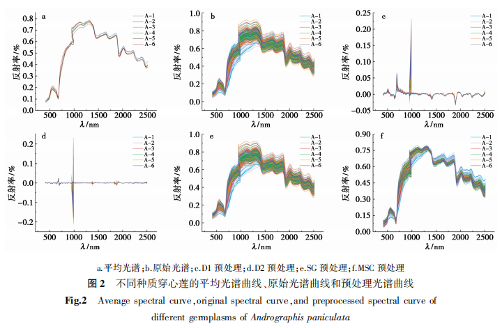 对不同种质的穿心莲样品Raw Data求平均值,绘制平均光谱曲线图(图2a)。从总体上看,不同种质的穿心莲平均光谱曲线变化趋势较为相似。光谱曲线在550 nm处形成吸收峰,在670~1300 nm内呈上升趋势,尤其是670~960 nm,反射率急剧增大,在1300~2500 nm范围内呈波动下降趋势,有明显的吸收峰和吸收谷。