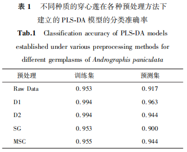 将穿心莲样品Raw Data经D1、D2、SG、MSC预处理后,建立PLS-DA模型,结果见表1。