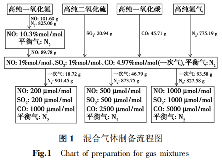 氮中一氧化氮、二氧化硫、一氧化碳气体标准物质按照GB/T 5274.1-2018《气体分析校准用混合气体的制备称量法》[15]制备。具体制备流程见图1。