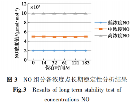 根据一氧化氮、二氧化硫、一氧化碳红外吸收峰的位置不同,分别测量出不同气体的浓度,而且能够监测出在配制过程中极易产生的二氧化氮杂质。采用与浓度值相近的同基体一级标准物质比较的方法对混合气体进行定值。