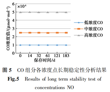 采用经典稳定性研究方法(趋势分析)对配制的混合气体进行长期稳定性考察。基于先密后疏的原则,共进行了6个月的稳定性考查,其稳定性变化及统计检验结果见图3~5。