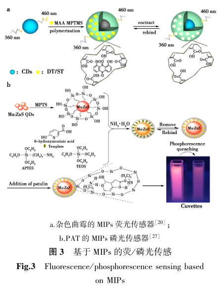 荧光传感器以荧光作为响应信号,主要由荧光基团、识别基团和连接体3部分构成;具有选择性好、灵敏度高、抗干扰能力强等优点。根据荧光响应模式,可将荧光传感分为荧光增强、荧光猝灭、比率型荧光检测等类型。如图3a所示,Xu等[20]首先制备了的蓝色荧光碳点;然后以1,8-二羟基蒽醌为模板分子,丙烯酰胺为功能单体,采用溶胶-凝胶法在碳点表面包覆了MIPs,构建了杂色曲霉毒素分子印迹荧光传感器。