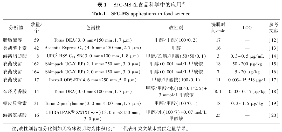 食品对人们的健康起着重要的作用。因此,无论是从科学还是从社会的角度来看,食品分析都是一个非常重要的领域[9]。食品分析是一项具有挑战性的任务,其样品基质种类繁多,待测化合物在物化性质和浓度水平上可能不尽相同。此外,干扰化合物经常存在,有时目标化合物存在于低浓度水平,这使得高灵敏度和选择性的分析方法成为食品分析领域的刚性需求[10]。SFC-MS可以提高在分析复杂样品中痕量化合物时的高选择性、灵敏度,并缩短分析时间,这有助于其在食品分析领域的更多应用[11]。此外,SFC-MS还应用于检测其他食品污染物,如激素、芳香胺等等。表1总结了SFC-MS在食品相关领域中的部分应用。