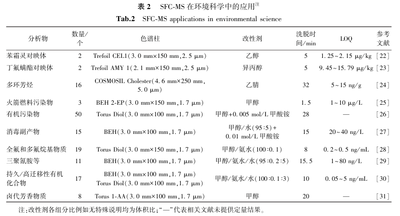 当前,出现在环境中的大量药物引起了人们极大的关注,包括一些药品和个人护理产品、非法药物、杀虫剂等。这些有机化合物的残留物、微生物降解产生的代谢物和非生物过程产生的其他副产品容易在水环境和其他环境(如土壤、空气)中持续存在,不及时监管则会导致饮用水、植物和食物链污染,进而危害人体健康[21]。表2总结了SFC-MS在环境相关领域中的部分应用。
