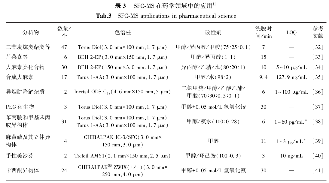 天然药物已被广泛用于疾病治疗和保健。药食同源类物质(人参、菊花、八角等)本身可以作为实用性的中药材,同时也兼具药食的功能并作用于医疗保健领域。目前,紫杉醇、黄连素、麻黄碱、青蒿素等天然有效成分已被开发成现代药物。而对于大多数药材来说是以多组分形式使用的,如银杏叶提取物、洋甘菊提取物和人参制剂等。因此,对药材中多种化学成分的分析不仅为新药开发提供了机会,也是药材质量控制的关键。SFC-MS在小分子药物的活性药物成分、合成中间体、杂质或降解产物、手性拆分方面应用广泛。表3总结了SFC-MS在药学领域中的部分应用。