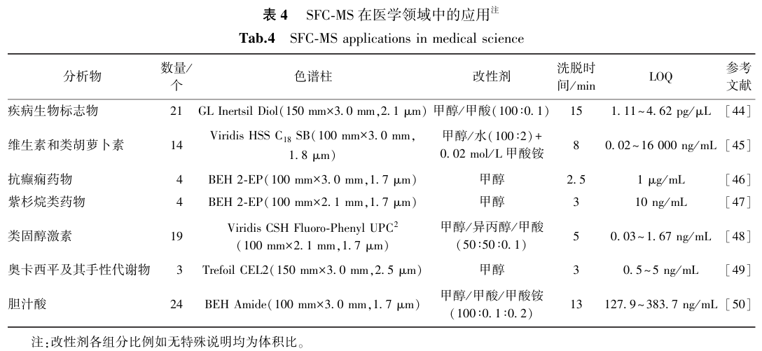 代谢物应用于疾病的临床前模型和临床应用,作为潜在的疾病生物标记物,包括脂类、类固醇激素、胆汁酸、极性代谢物、多肽和蛋白质等[42,43]。SFC-MS在体内代谢物的定性、定量分析中应用广泛。表4总结了SFC-MS在医学领域中的部分应用。