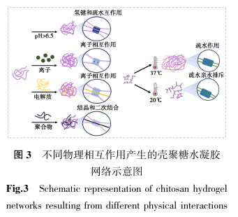 一般物理交联壳聚糖生物墨水的凝胶方式主要通过碱性或中性环境触发离子凝胶过程,以及通过氢键、疏水作用以及范德华力引发交联[12]。不同物理相互作用产生的壳聚糖水凝胶网络示意图,如图3所示。