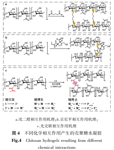 化学交联壳聚糖水凝胶相比于物理交联具有可调节共价交联网络的优势。共价交联网络密度主要受交联剂的类型、交联剂的浓度、交联点的数量和活性以及交联方式影响[23,24]。壳聚糖墨水的化学交联主要是通过壳聚糖上的氨基或羟基与交联剂或改性后的壳聚糖与引发剂之间共价相互作用形成的。应用于3D打印的化学交联方式主要有非光交联和光交联两种方式。常见的交联剂交联机理如图4所示。