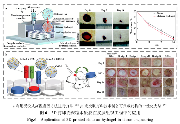 Zhou等[48]设计了一种不需要有机溶剂的壳聚糖墨水,该墨水具有温度响应特性,通过浸没式高温凝固方法进行打印,如图6a所示。Teoh等[49]基于光交联设计了一种甲基丙烯酸酯壳聚糖墨水,该墨水制备的水凝胶可以负载药物并促进NIH/3T3细胞的生长与增殖,如图6b所示,负载特定药物的水凝胶组在小鼠伤口缺损第21 d伤口闭合率最高,伤口闭合率在90%以上。
