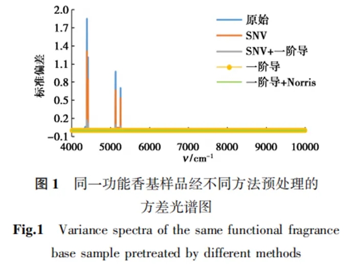 原始光谱和经标准正态变换(Standard Normal Variate, SNV)、一阶导、SNV+一阶导、一阶导+Norris平滑预处理后光谱的方差光谱见图1。