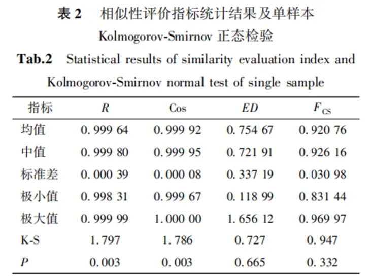 基于经预处理后的特征光谱范围内的近红外光谱数据,计算功能香基GNA各合格样品与标准品的相似度,相似性评价指标值统计结果及单样本Kolmogorov-Smirnov检验见表2。