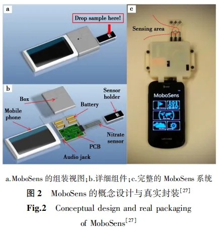 耳机插孔和USB传输是有线传输的两种重要方式。Nemiroski等[26]是最早将基于智能手机的电化学传感器应用到环境污染物检测领域的。他们构建了一种简单、经济实惠的手持设备用来检测水中痕量重金属(铅、镉和锌)。使用音频插孔传输数据,保证了与现有手机或蜂窝网络的广泛兼容性。Wang等[27]开发了一种基于音频插孔的紧凑型移动传感平台MoboSens。如图2所示,它包含了光刻沉积的三电极传感器、APP和电路板,能在1 min内检测水中的硝酸盐浓度,在0.1 ~ 5 mmol/L线性范围内具有低检测限。
