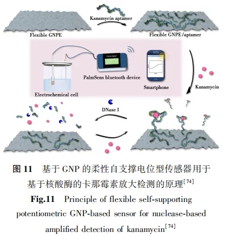 电位法是一种静态界面的电化学分析技术,其核心原理是测量电解质溶液中的电极电位来确定化学物质的浓度或活性,广泛应用于pH测量、金属离子测定和其他各类化学物质的分析,因其简便、快速和灵敏而受到青睐。Yao等[74]开发了一种基于柔性独立式石墨烯纸的超灵敏无线电位适配体传感器检测卡那霉素。检测机理如图11所示,该电位生物传感系统引入了核酸酶辅助扩增策略显著提高检测灵敏度。